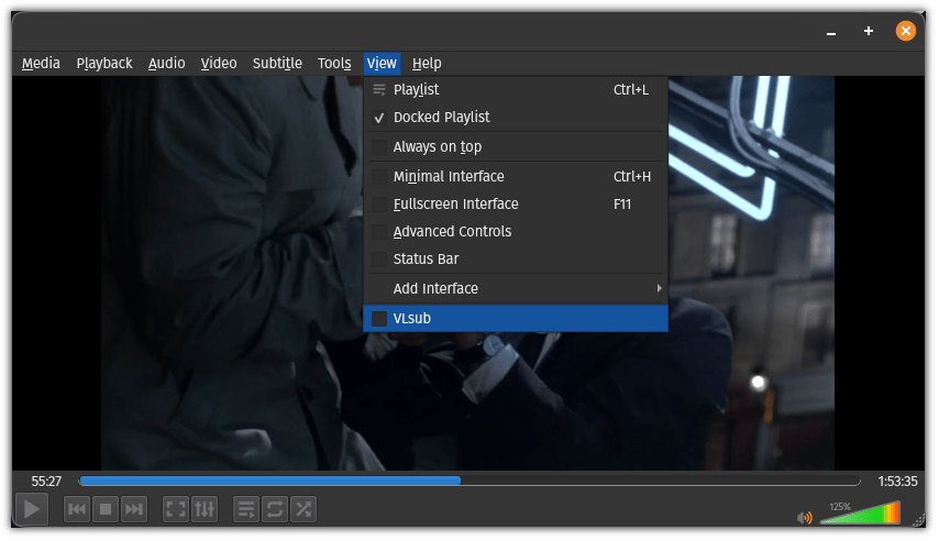 现在,打开VLC播放器,在 “ 视图 View ” 菜单下,你将找到 “VLsub”: