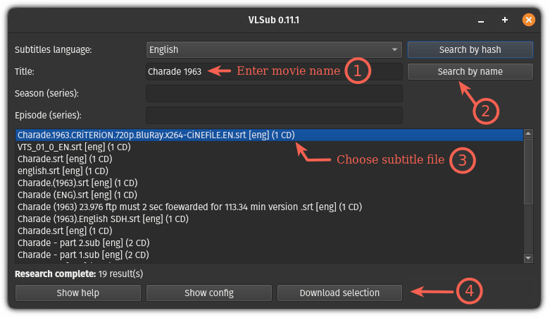 要使用 VLsub 下载字幕,首先,输入电影名称和年份以获得更好的结果,然后点击“ 按名称搜索 Search by name ”按钮,从结果中选择字幕文件,然后单击“ 下载选择 Download selection ”按钮,如图所示 :