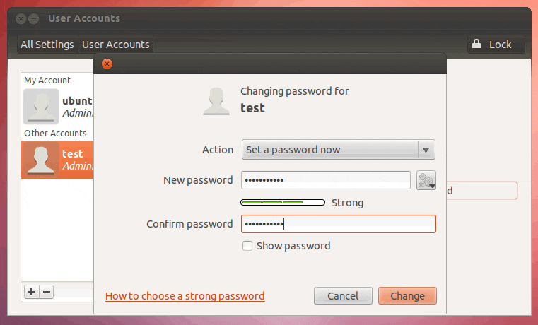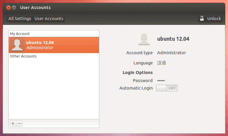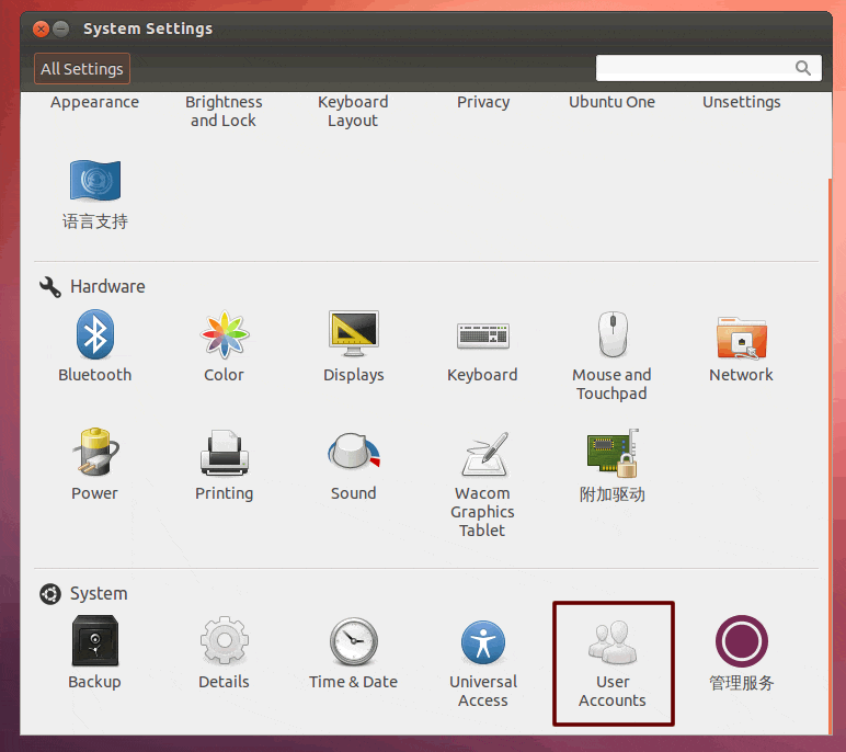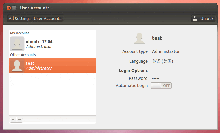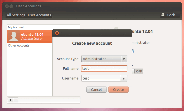然后,我们需要添加一个测试用户。我们可以在 "System Settings"==>"User Accounts" 中找到添加用户的功能。