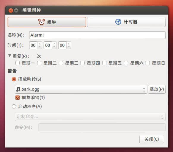 给你的一个闹钟起个名字,然后设置时间,重复,对重复是我需要的,我需要每天都提醒我,我就是要这个功能,周一到周日全都要。设置一个我喜欢的铃声。嗯,下面的启动程序是什么意思?嗯,我也不知道,不管它了,点击关闭。