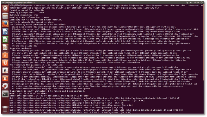 sudo apt-get install -y git cmake build-essential libgcrypt11-dev libjson0-dev \ libcurl4-openssl-dev libexpat1-dev libboost-filesystem-dev \ libboost-program-options-dev binutils-dev libboost-test-dev libqt4-dev \ libyajl-dev expect zenity gksu libnotify-bin