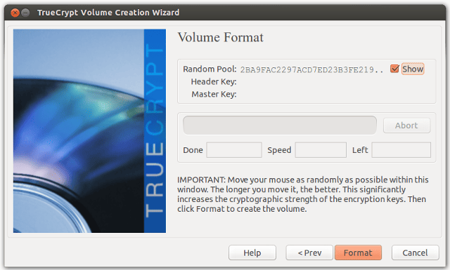 • 接下来,持续猛烈晃动你的鼠标几秒钟(译者注:该步骤用来生成密钥,晃动越无规律时间越长越好),然后点击Format,最后输入刚才设置的密码,整个加密条目的创建过程就完成了。