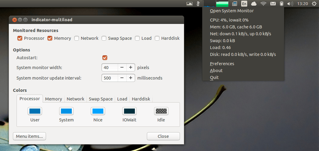 系统负载 是系统监控工具GNOME里的一个小应用。它能在面板上展示出CPU、内存、网络使用、硬盘I/O等信息。点击下面的按钮从Ubuntu软件中心安装。