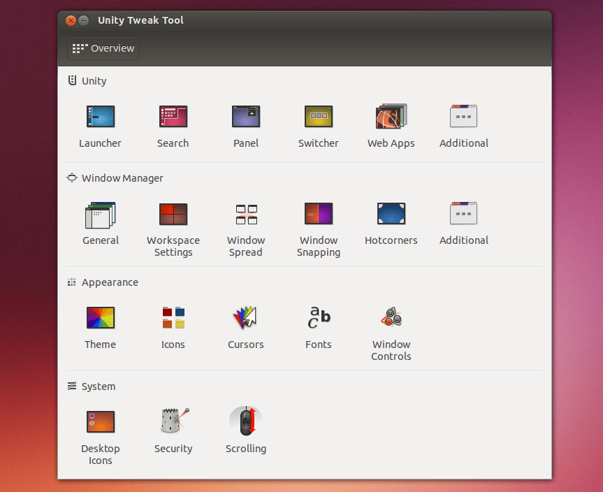 Unity Tweak Tool让用户能改变一些Unity设置,比如:自动隐藏、窗口最大化、“触发角”、Dash、Unity启动器或平视显示器、改变GTK或图标主题、改变字体和大小,移动窗口控制器到右边等。