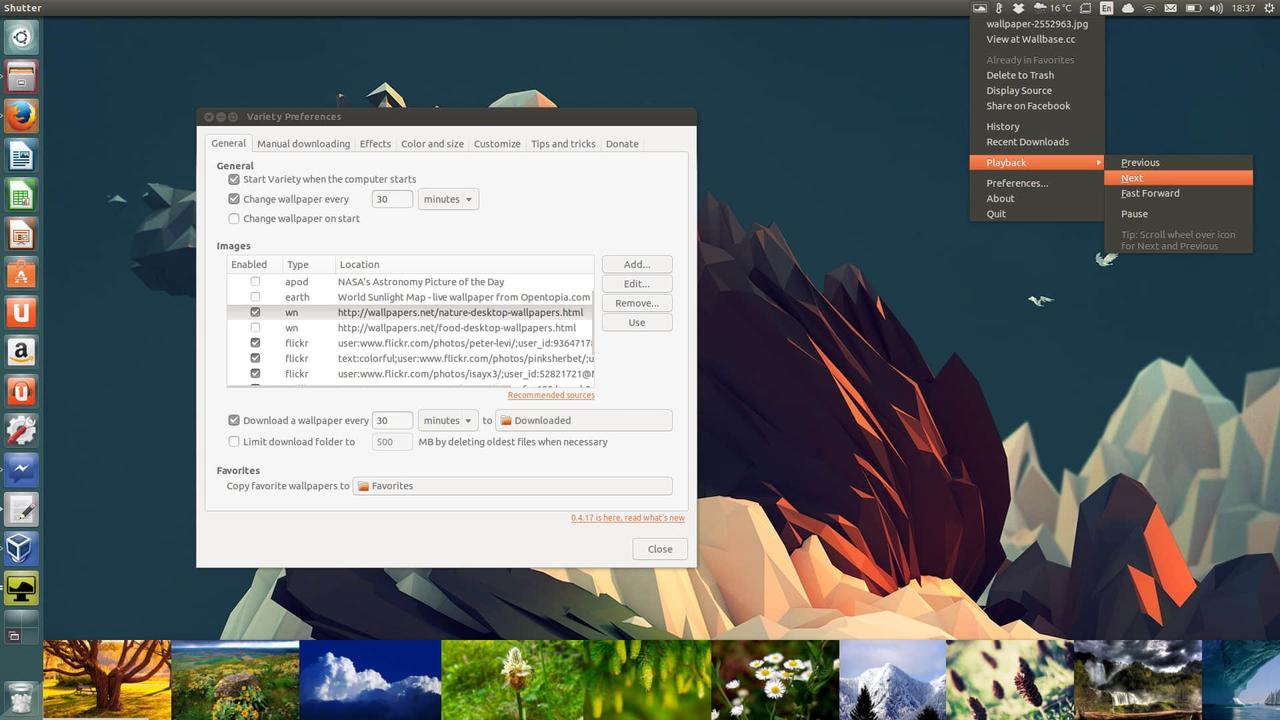 Variety一款带有AppIndicator的应用,但是基本上你只需要配置一次就可以用指示器来使用此软件了。Variety是一款很酷的壁纸更换的应用,他能在设定的时间内自动下载并更换壁纸。用起来就有种高帅富的感觉。壁纸库每天都会有更新,你可以很快的切换到另外一个壁纸,收藏自己喜欢的壁纸,留着日后再用。