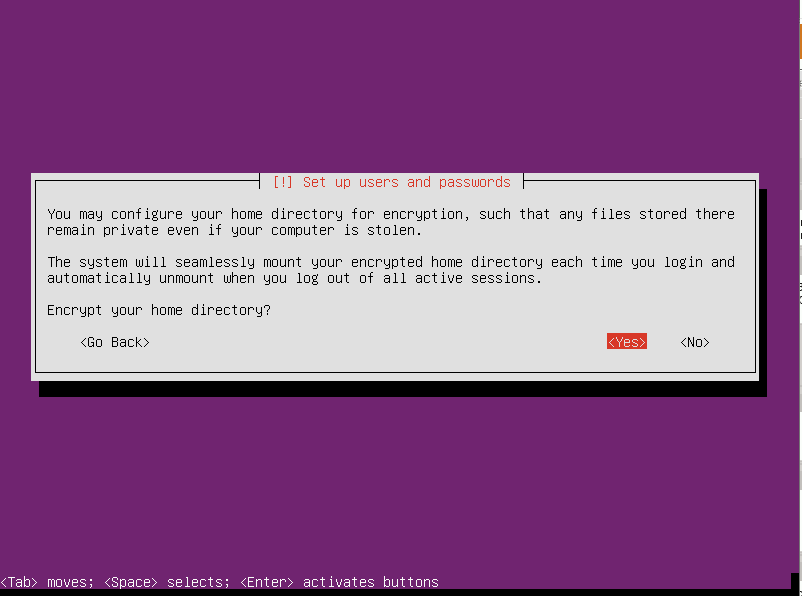如果你想加密用户主目录,选择Yes,否则选择No(译注:这点无所谓。):