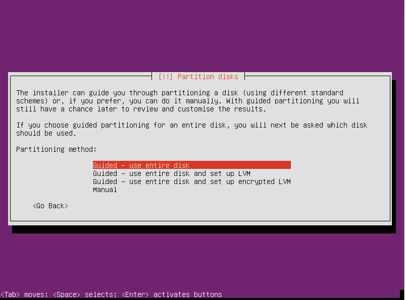 选择分区方案(译注:如果你有特定需求,可以采用manual分区方式,没有经验的用户可以使用预设的Guied分区模式。关于分区,是一个值得系统管理员仔细研究的课题,建议搜索更多深入的文章来看看,或者在此进行讨论):