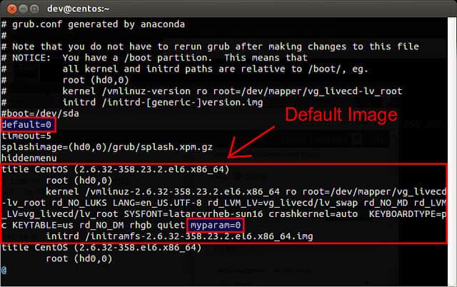 在CentOS上,想要在启动时添加内核参数,你可以直接编辑GRUB配置文件 /boot/grub/grub.conf。在配置文件中,找到描述默认使用的Linux映像的条目。文件中最顶行的字符串 “default=N”会指示哪一个条目是默认的映像。