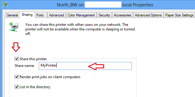 接着,选择“Sharing(共享)”标签页,勾选‘Share this printer(共享这台打印机)’复选框来共享。记住共享打印机的名字,因为你要使用这个共享名来连接这台打印机。