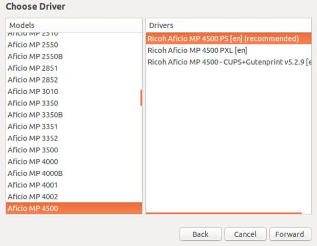 接着,选择打印机品牌和型号。假如你在列表中看不到特定的型号,选择一个最接近它的然后继续。