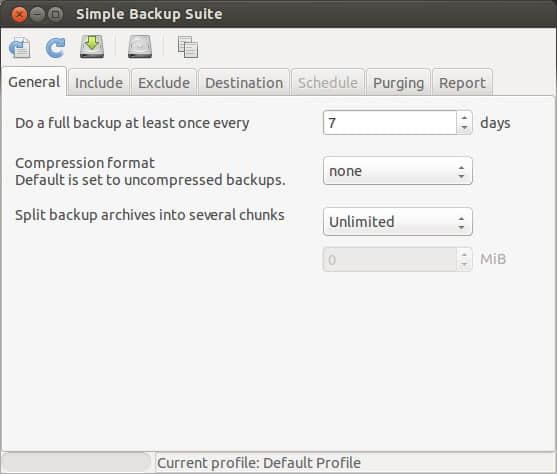 在 General 选项内,你可以选择多久进行一次完整备份,默认是7天。每7天 SBackup 将会进行一次完整的备份。你也可以选择备份的压缩格式。