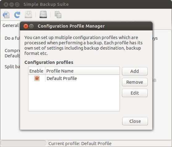 最初的 SBackup 没有任何用户自定义的配置文件,只有默认的配置文件。需要注意的是,用户不能删除默认的配置文件。若要创建一个新的配置文件,点击 Tools -> Profile Manager,将看到如下窗口