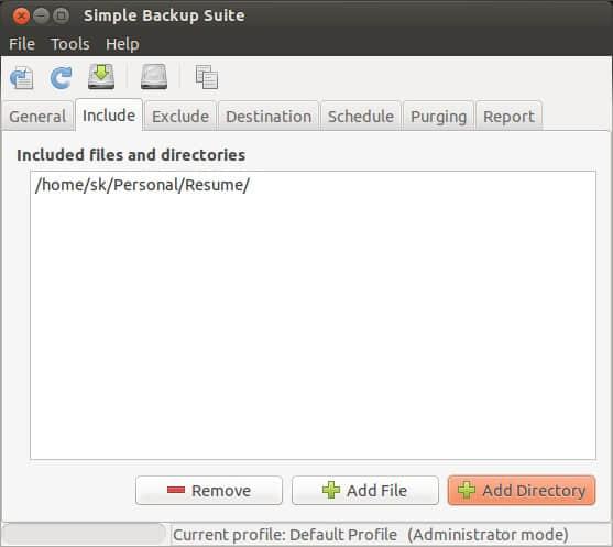 这个选项不需要解释太多,你可以添加 SBackup 要备份的文件或目录。这里可以选择备份单独的文件或者完整的目录,我删除了所有的目录仅仅保留了“Resume”