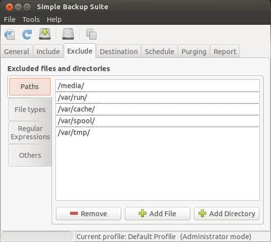 如同 Include 选项,我们可以选择备份时排除的文档和目录,只需要选择要排除的文档和目录的路径即可。在默认配置下,/media, /var/run/, /var/cache/, /var/spool/ 和 /vat/tmp/ 目录均被排除