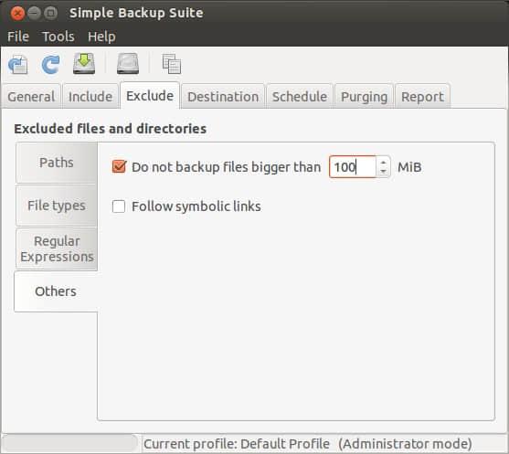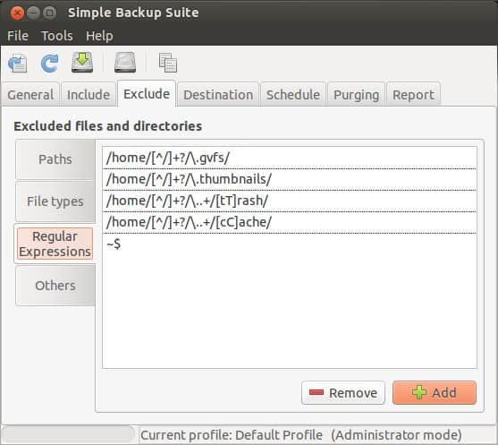 更进一步的是,你可以增加备份时排除文件的类型,像 mp3 和 avi 等等。在默认配置下,mp3, avi, mpeg, mkv, ogg 和 iso 是被排除不被备份的。如果你想备份这些文件,只要选中然后点击 remove。当然,如果要排除其他类型的文件,只需要点击 add 然后增加。