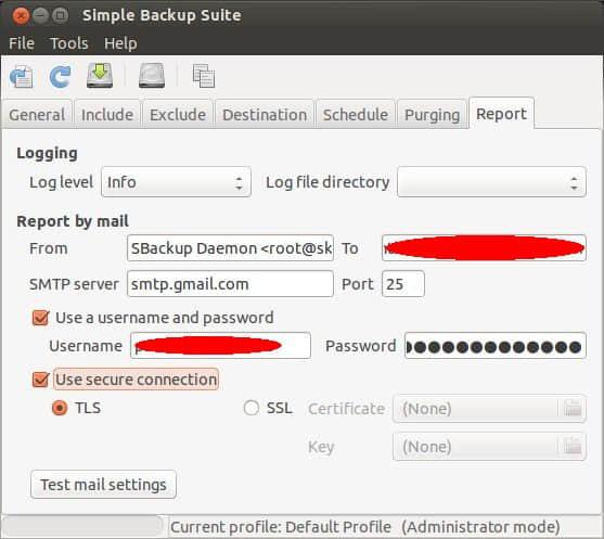 Report 是最后一个选项卡,在这里你可以设置接收备份完成通知的邮箱。输入你的邮箱ID、SMTP服务地址、邮箱用户名、密码后,点击 Test mail settings。需要留意的是,在测试邮箱设置前,点击工具栏中的Save Configuration按钮保存你的配置。