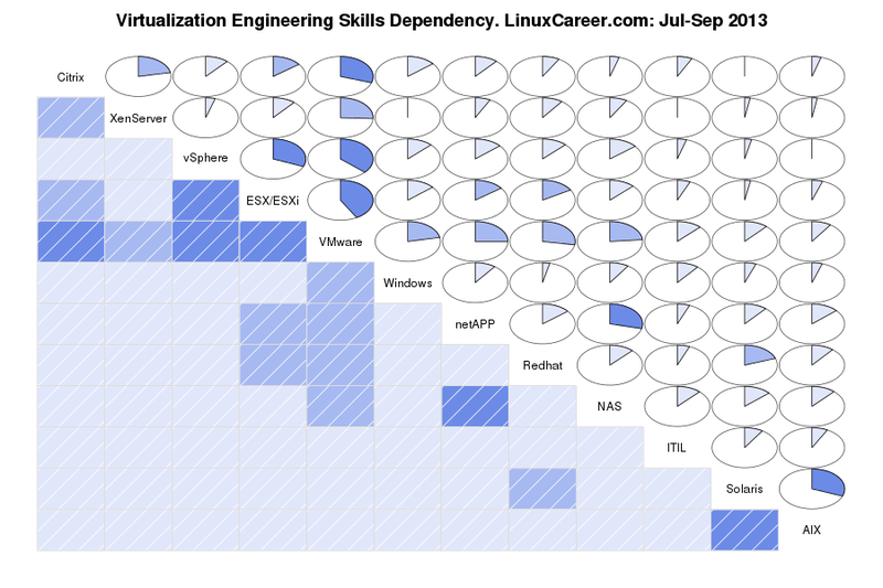 目前第二大需求技能组是如下依赖图所示与虚拟化技术工程师相关的技能。这一组可进一步细分成两部分,第一部分是Redhat, VMware, vSphere, ESX/ESXi, XenServer 和 Citrix,这些技能对寻求虚拟化技术工程师的工作很重要;第二部分是同Unix系统、数据仓储及管理相关的技能。同时这两部分是紧密联系的。显然VMware和ESX/ESXi及vSphere是相关的,因为ESX/ESXi是VMware虚拟机下提供的虚拟产品,而vSphere是VMware虚拟机的云端虚拟操作系统。Redhat和VMware、Citrix产品被分到同一部分同样有其原因。这里Solaris和AIX具有密切关系的原因可以理解为它们都是专有的Unix系统,掌握其一便可。