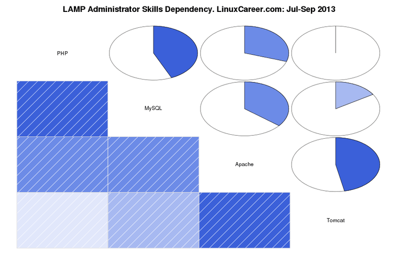 最后,第三大技能组是如下依赖图中显示雇主需求的LAMP管理员应具备的技能。LAMP是Linux、Apache、MySQL和PHP的简称,所有这四项内容是作为一名LAMP管理员所要了解的核心。这是一组相对来说小规模却会引领你至在Linux路途中发展更远的技能。实际上,PHP和MySQL的密切关系表明这些技能中的任一项都不能脱离其它技能来单独掌握。