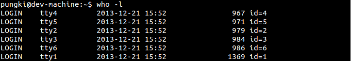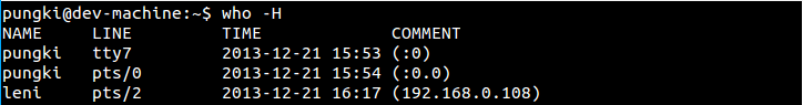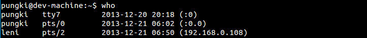 空闲时间 包含了最近最后一次活动以来消逝的时间. 所以,00:13 意思是 用户leni已经13分钟没执行过命令了. (.)符号 是指该终端过去的一分钟有过活动。在那期间,我们称之为 “current” 。PID 是用户shell程序的进程ID号。
