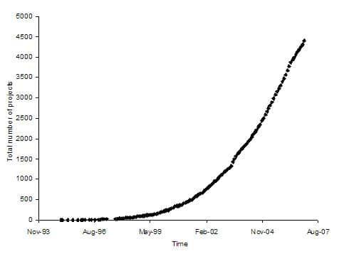 虽然Dirk Riehle对于开源项目增长的分析并不是特别过时,当然,一部分已经增长的趋势除外: