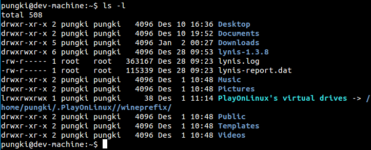 - 第一个字母d意味着内容是目录或者文件。在上面的截图中,Desktop、 Documents、 Downloads 和 lynis-1.3.8是目录。如果是'-'(减号),这意味着它的内容是文件。当它是l(小写l字符),意味这内容是链接文件。