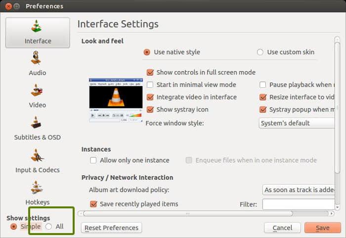 VLC->Tools->Preferences