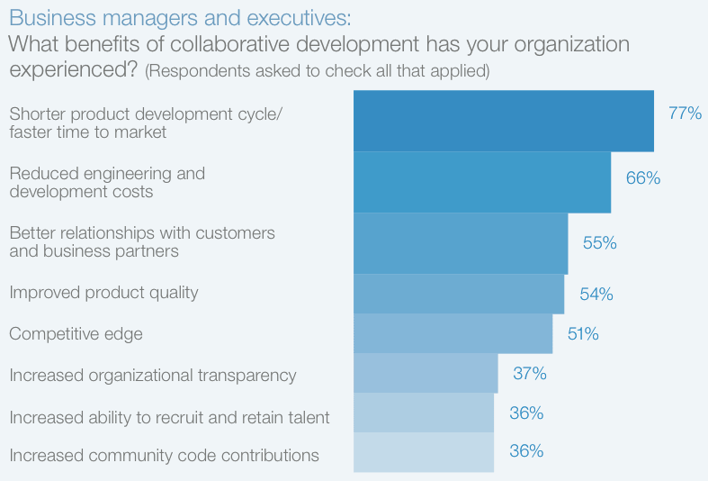 这一调查结果的潜台词很明显:开源软件开发更多是受到商业需求的驱使。事实上,44% 的企业管理者表明他们会在未来六个月内增加对软件协同开发的投资,另42%的企业管理者也说他们计划维持目前的投资数额。没有受访者表明他们打算削减投资。