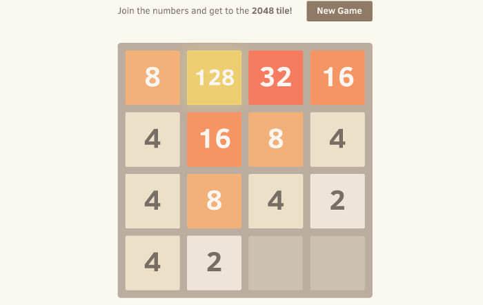 2048是最近全世界范围内的流行游戏。这个小游戏通过上下左右移动访客来完成。这个游戏的目标是通过组合匹配数字的方块到2048。如2+2变成4,4+4变成8等等(译注:原文4+4 becomes 16应为笔误)。听上去很简单但是相信我这是一个让人上瘾的游戏。