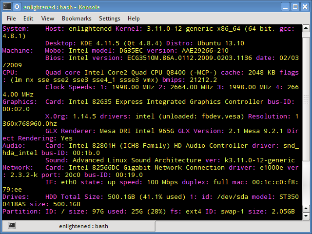$ hwinfo --short cpu: Intel(R) Core(TM)2 Quad CPU Q8400 @ 2.66GHz, 2000 MHz Intel(R) Core(TM)2 Quad CPU Q8400 @ 2.66GHz, 2000 MHz Intel(R) Core(TM)2 Quad CPU Q8400 @ 2.66GHz, 2666 MHz Intel(R) Core(TM)2 Quad CPU Q8400 @ 2.66GHz, 2666 MHz keyboard: /dev/input/event2 AT Translated Set 2 keyboard mouse: /dev/input/mice Microsoft Basic Optical Mouse v2.0 graphics card: Intel 965G-1 Intel 82G35 Express Integrated Graphics Controller sound: Intel 82801H (ICH8 Family) HD Audio Controller storage: Intel 82801H (ICH8 Family) 4 port SATA IDE Controller Intel 82801H (ICH8 Family) 2 port SATA IDE Controller JMicron JMB368 IDE controller network: eth0 Intel 82566DC Gigabit Network Connection network interface: eth0 Ethernet network interface lo Loopback network interface disk: /dev/sda ST3500418AS partition: /dev/sda1 Partition /dev/sda2 Partition /dev/sda5 Partition /dev/sda6 Partition /dev/sda7 Partition /dev/sda8 Partition cdrom: /dev/sr0 SONY DVD RW DRU-190A usb controller: Intel 82801H (ICH8 Family) USB UHCI Controller #4 Intel 82801H (ICH8 Family) USB UHCI Controller #5 Intel 82801H (ICH8 Family) USB2 EHCI Controller #2 Intel 82801H (ICH8 Family) USB UHCI Controller #1 Intel 82801H (ICH8 Family) USB UHCI Controller #2 Intel 82801H (ICH8 Family) USB UHCI Controller #3 Intel 82801H (ICH8 Family) USB2 EHCI Controller #1 bios: BIOS ... TRUNCATED ...