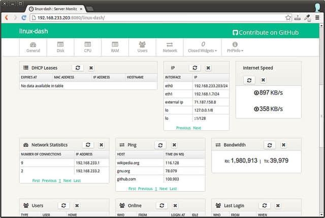 下面是linux-dash的截图。web面板包含了几个小部件,每个都会显示特性的系统参数。你可以通过重安排并且/或者关闭一些小部件来自定义web面板的外观。这里是一个linux-dash创建者的演示站点。