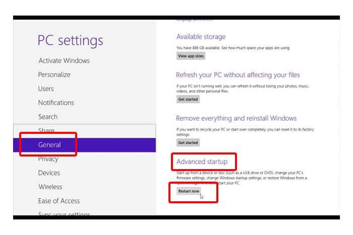 Windows 8的:在Windows 8中,你需要进入通用PC设置,并选择高级启动,然后点击立即重新启动: