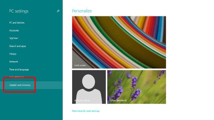 Window 8.1的:在 Windows8.1,从左侧边栏点击更新和恢复: