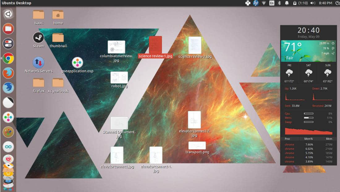 上面截图中使用的conky主题是Harmattan,它可以以15种不同的样式来显示时间、天气、以及系统进程。要安装该主题,你可以从deviantART下载zip文件,然后解压。将.conky-weather文件夹和位于主题文件夹的.conkyrc文件(你可能需要按Ctrl+H来显示这些隐藏文件)移动到你的home文件夹。Conky有很多的主题。尝试这些主题,你所需要做的就是用所要使用主题的.conkyrc文件替换在home文件夹的.conkyrc文件。
