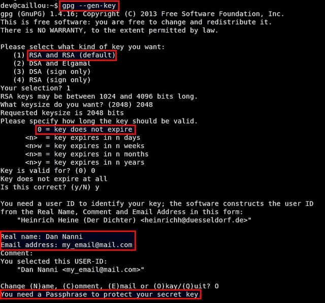 执行该步骤,会询问你如下问题。如果你不确定,可以选择接受默认回答。作为密钥生成部分,你将要为你的密钥创建一个加密口令,这个口令实际上是你访问存储在本地密码仓库中的任何密码信息时的主密码。成功创建密钥对后,创建的密钥对会存储在~/.gnupg目录中。