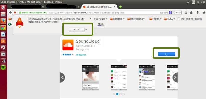 Firefox应用市场是Chrome商店的替代品,类似于Firefox网页浏览器的应用市场,里面提供了一些用于Firefox智能手机OS的应用。在Firefox应用市场中搜索声云(SoundCloud),点击安装(install)来安装,并作为Web应用添加到Ubuntu中。