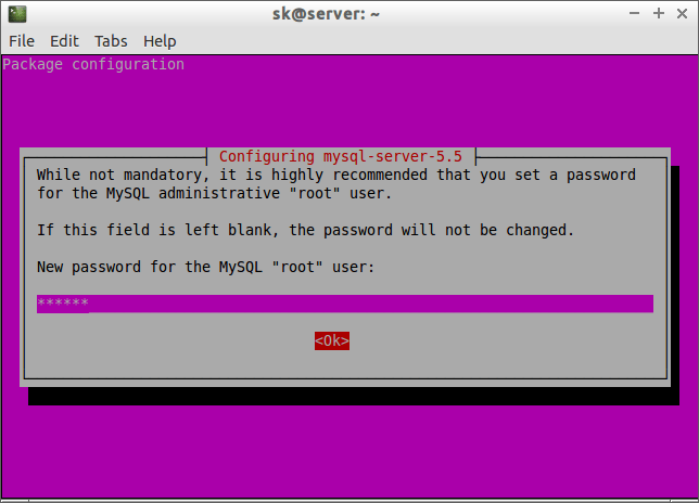 在安装MySQL的过程中,可能提示需要输入数据库管理员密码。输入密码后按下OK。