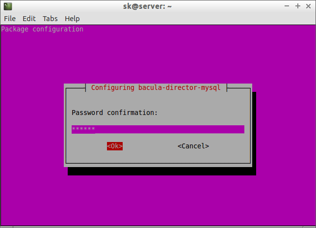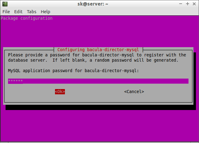 设置数据库的bacula-director-mysql用户的密码。如果留空不输入,会生成一个随机密码。