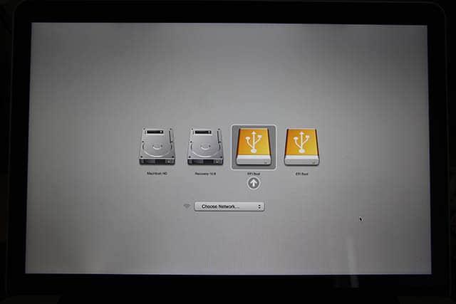 上述步骤完成后,将U盘插入并重启Mac Book Pro。当关机之后屏幕一黑时,请按住Option键(alt)直到你看到不同的启动选项。选择EFI选项(如果有两个的话选择左边的哪一个)来从USB启动Ubuntu.