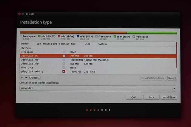 到分区这个步骤之后, 选择 "Do Something else" 这个选项。 然后请确保那块大约128MB左右的分区已经被识别为EFI启动分区(你可以点击它然后选择Option来确定一下; 另外,那个分区应该是 /dev/sda1)。下一步, 你要在新建的空间里创建一个 ext4分区,在其上挂载“/”路径。 如果你知道你自己在干嘛的话也可以创建几个不同的分区(切记这不是Windows啊孩纸)。