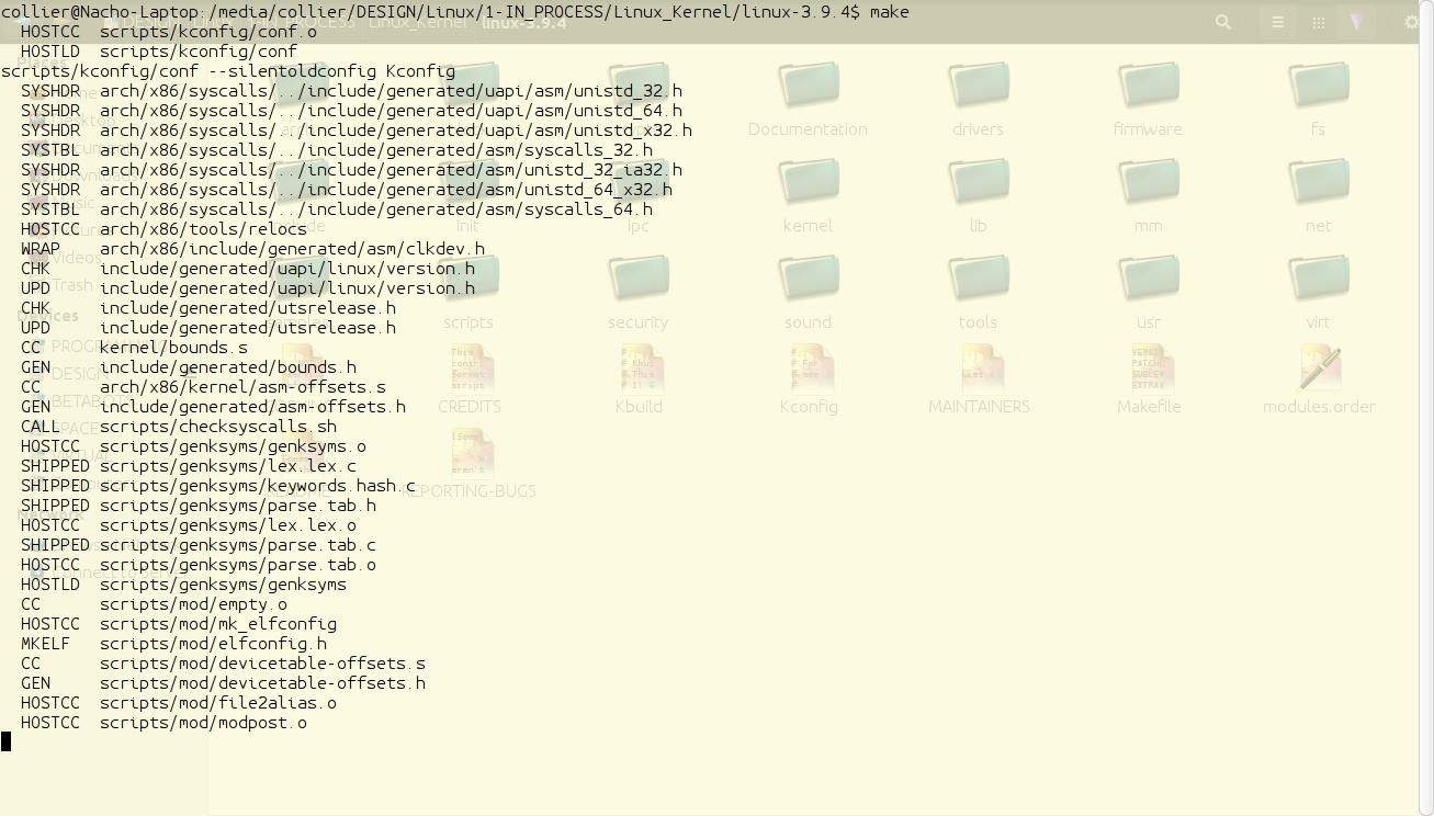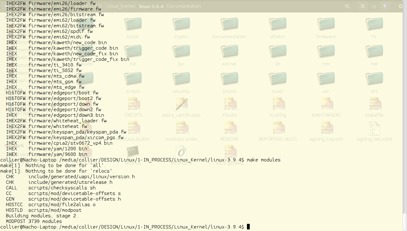 为了编译内核,在内核源代码相同目录下,在终端内输入"make"。这会花费一些时间。完成之后,必须通过"make modules"来编译模块。为了从一开始就简化编译过程,输入"make; make modules"。这会先编译接着是模块,而不用用户再回来输入"make modules"。