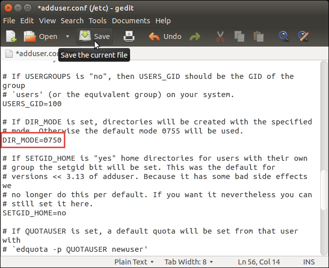 在adduser.conf文件中向下滚动到DIR_MODE命令处,这里的默认值是“0755”。修改该值来反映你想要授权给各种用户类型(属主,属组,其它人)的不同权限(r,w,x),如我们先前讨论过的“0750”或“0700”。点击保存(Save)。