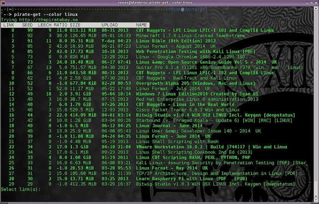 以上命令会返回与查询内容相关的特定搜索类目中的结果,输出结果也是彩色的!那里头,程序会提示你输入你想要的结果的编号,输入后就可以从磁链上下载种子了。简单又容易,仅限于没有版权的资料哦!