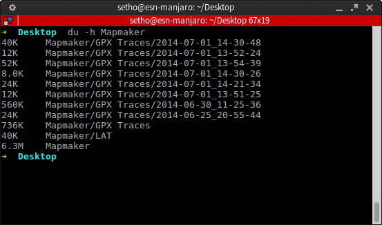 不带任何参数的运行du命令会显示当前工作目录以及其子目录的文件名和所占用的空间大小(以字节为单位)。