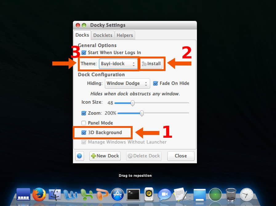 下载 Mac 主题从unity启动器上运行docky。你就能看到docky运行再你的屏幕底端了,点击第一个docky配置按钮,选择3D mode点击下载主题按钮在上面选择Buyi-idock主题,现在你将会获得Mac OS X很像的dock了。
