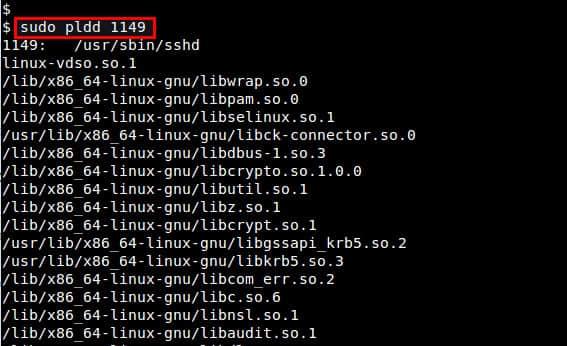 如果你想要找出被一个运行中的进程载入的共享库,你可以使用pldd命令,它会显示出在运行时被载入一个进程里的所有共享对象。