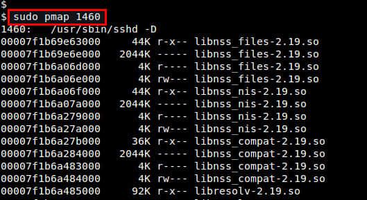 或者,也可以选择一个叫做pmap的命令行工具。它报告一个进程的内存映射,也能显示出运行进程的库文件依赖。