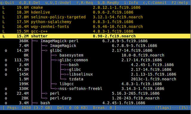 第三个方法是使用rpmreaper工具。这个工具本来是用作清理系统中无用以及它们所依赖的包,rpmreaper有很直观的ncurses界面来展示已安装的包和它们依赖关系的树形图。