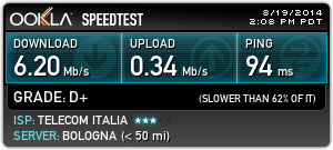 $ ./speedtest_cli.py Retrieving speedtest.net configuration... Retrieving speedtest.net server list... Testing from Telecom Italia (87.13.73.66)... Selecting best server based on latency... Hosted by LepidaSpA (Bologna) [12.20 km]: 104.347 ms Testing download speed........................................ Download: 6.35 Mbits/s Testing upload speed............................................... Upload: 0.34 Mbits/s