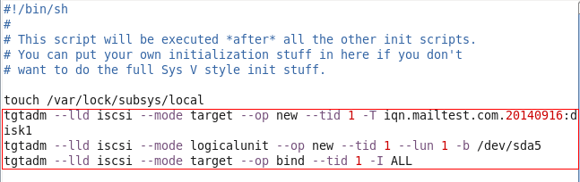 这在儿,有个要点需记住,那就是开机后,上面3条命令创建的iSCSI会失效,要想开机后还有,那就把上面的3条命令添加到/etc/rc.d/rc.local里面,看图: