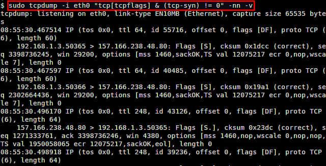 # tcpdump -i <interface> "tcp[tcpflags] & (tcp-syn) != 0"